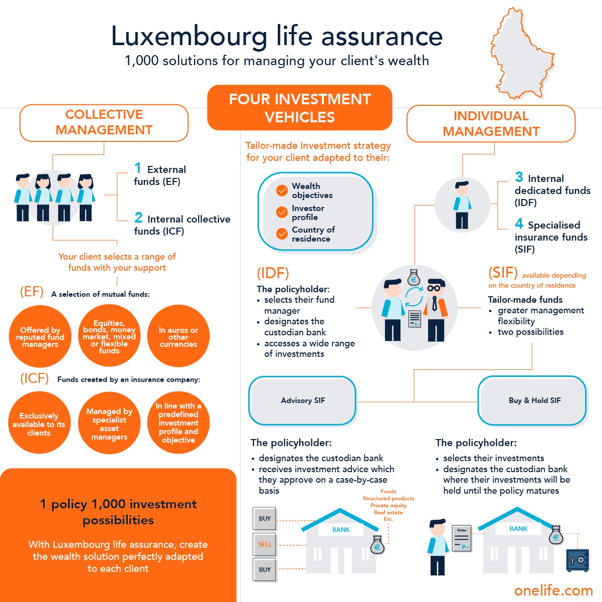 Luxembourg life insurance offers unparalleled flexibility and security in terms of investments. At the heart of this architecture are four vehicles adapted to the different forms of investment: external funds (EF), internal collective funds (CIF), internal dedicated funds (IDF) and specialised insurance funds (SIF).